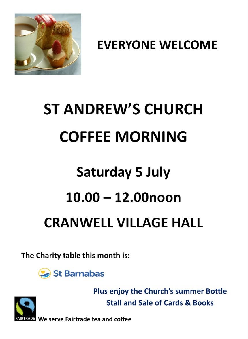 This Saturday 10:00-12:00 join us at the Village Hall for the monthly community coffee morning hosted by St Andrew’s Church.