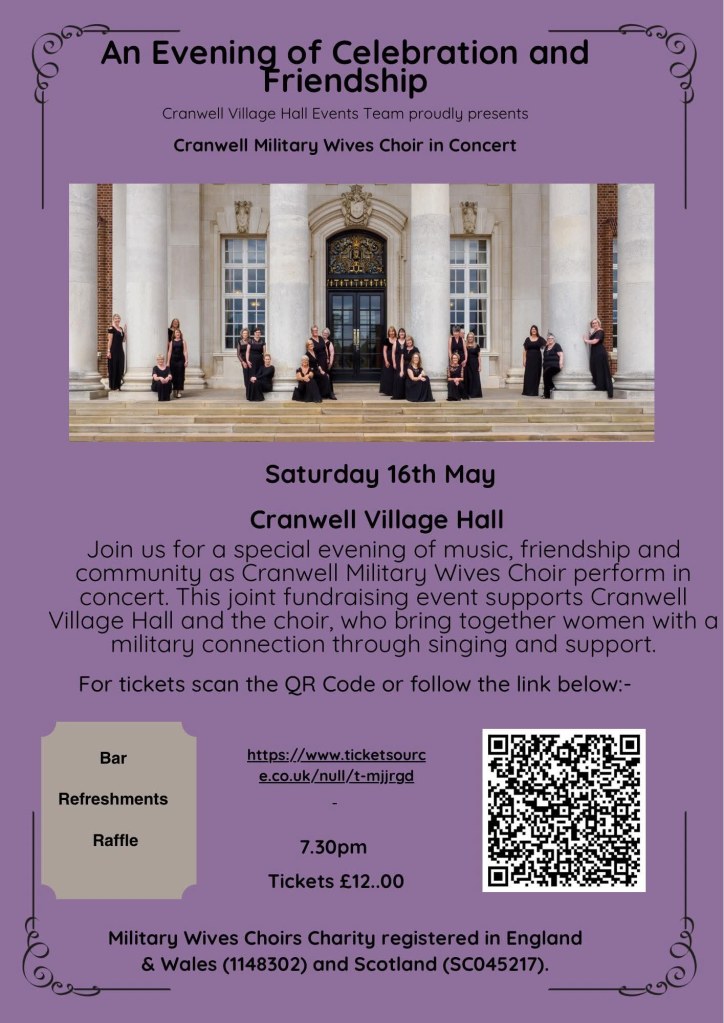 Join us for a special evening of music, friendship and community as Cranwell Military Wives Choir perform in concert. This joint fundraising event supports Cranwell Village Hall and the choir, who bring together women with a military connection through singing and support.